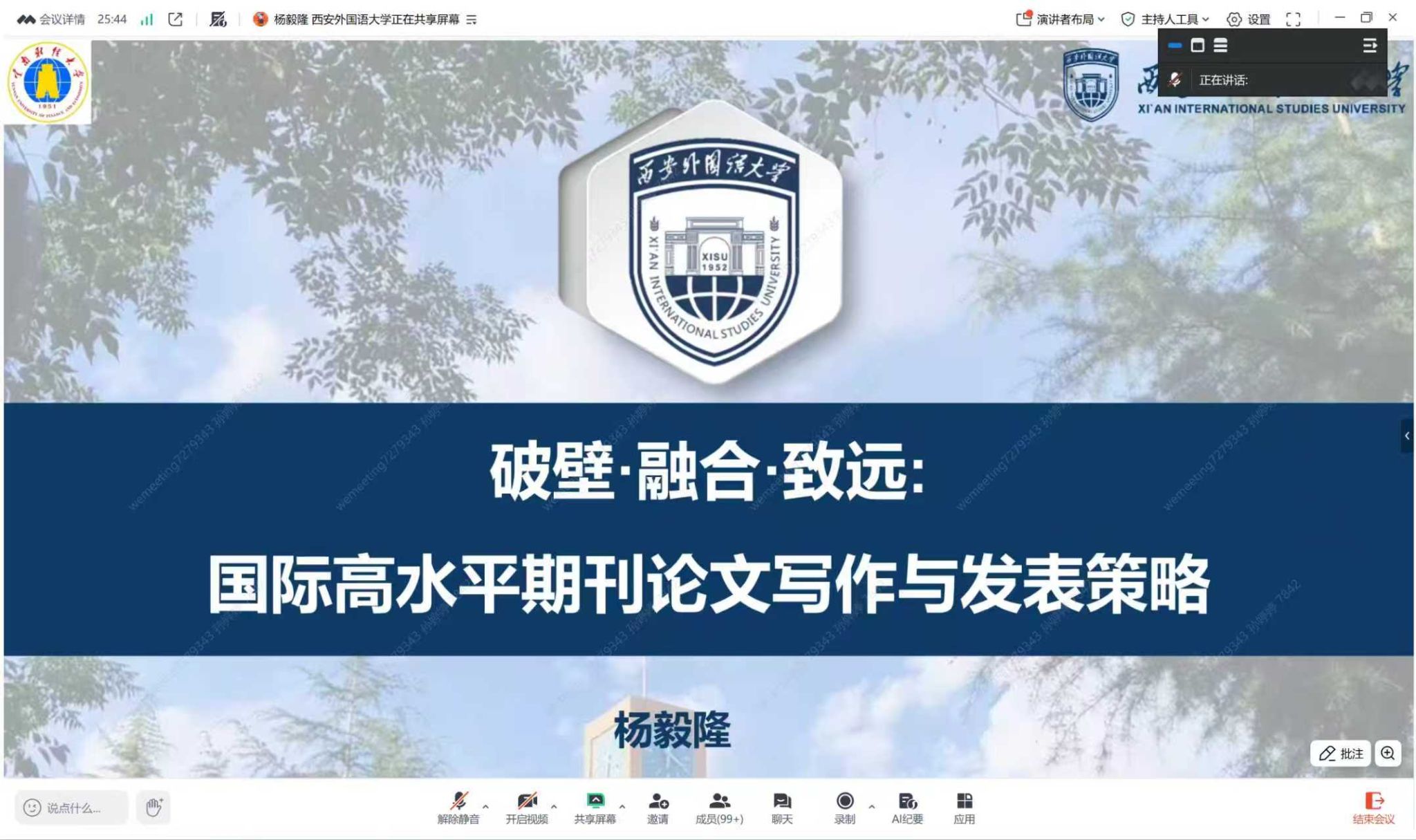 讲座聚焦于国际化背景下学术研究的发表路径与跨学科融合趋势。杨毅隆教授以其在语言学、心理学及认知神经科学交叉领域的深厚研究经验为基础,系统阐述了国际高水平期刊论文从构思、写作到投稿、修回的全流程策略。