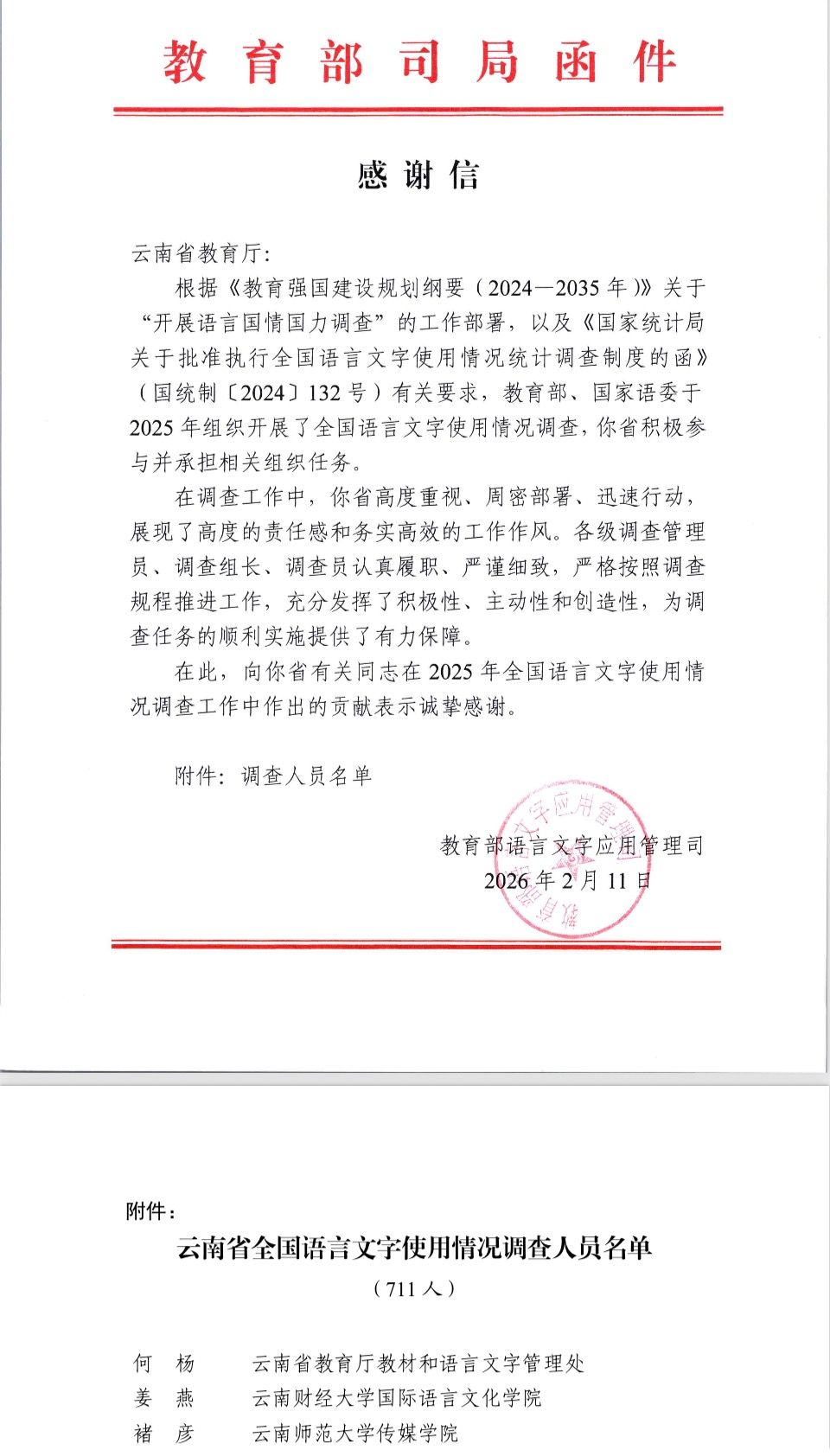 近日,教育部语言文字应用管理司向云南省教育厅发出感谢信,对云南省在2025年全国语言文字使用情况调查工作中作出的贡献表示诚挚感谢,国际语言文化学院中文系主任姜燕副教授作为省级调查管理员位列其中。