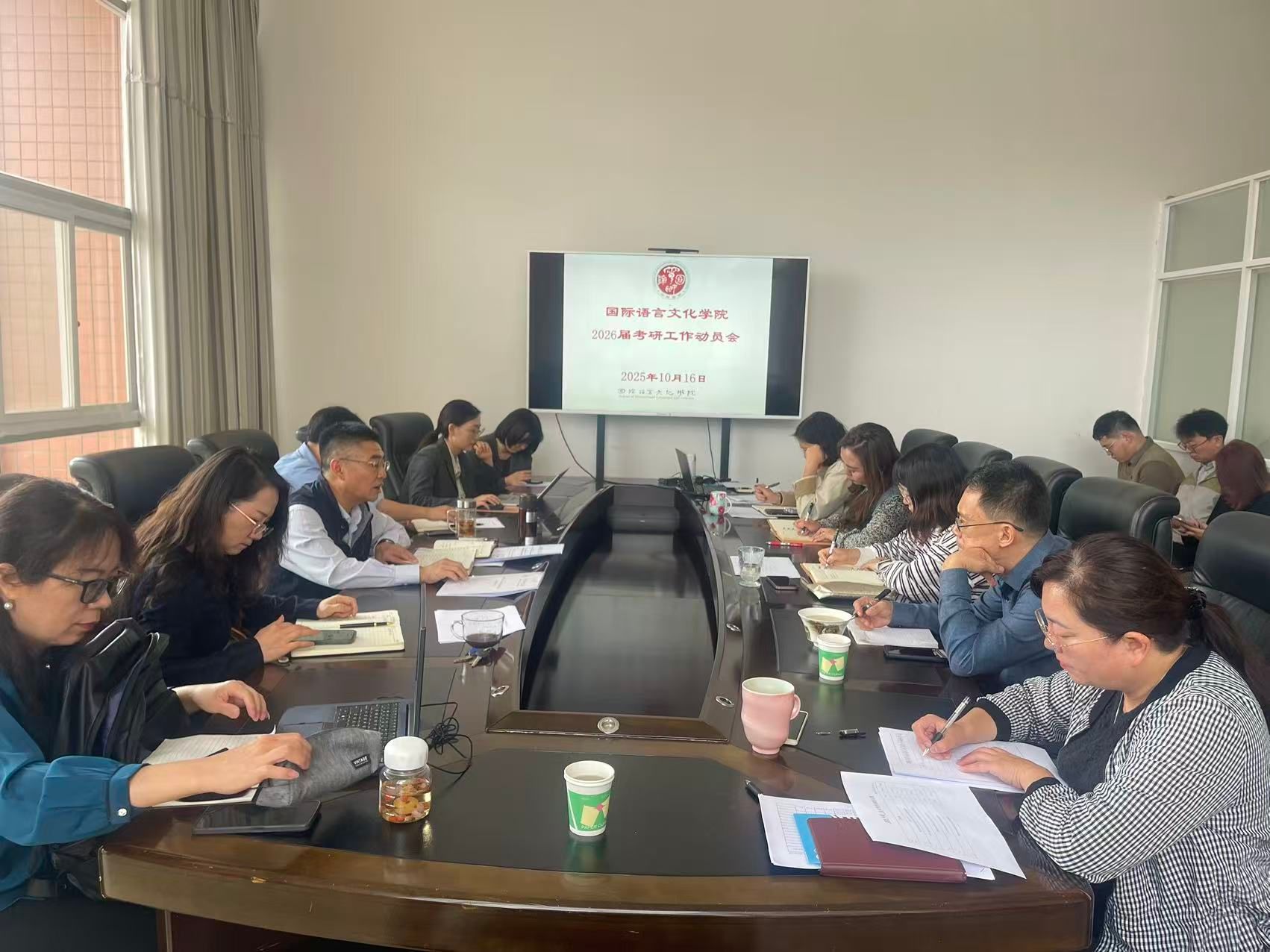 为深入贯彻落实学校关于提升人才培养质量与毕业生深造率的战略部署,全面启动并扎实推进学院2026届毕业生考研工作,国际语言文化学院于10月16日召开2026届考研工作动员大会。学院党政领导班子成员、各教学系主任以及全体2026届毕业班班主任参加,共同为考研工作擘画蓝图、凝聚共识。