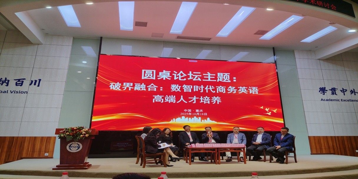 与此同时,刘代容院长与商务英语系主任马骞还赴四川外国语大学参加第二届全国商务英语研究生培养高层论坛暨四川外国语大学商务英语研究生培养十周年学术研讨会。在研讨会上,中国对外贸易经济合作企业协会国际商务与语言服务工作委员会会长王立非教授,四川外国语大学商务英语学院院长胡文飞教授,西南财经大学外国语学院院长张家瑞教授,广东外语外贸大学国际商务英语学院院长胡春雨教授等多位国内商务英语领域的顶尖学者带来了精彩的主旨发言。刘代容院长应邀参加了圆桌论坛,与多位专家齐聚一堂,围绕商务英语人才培养、师资队伍建设以及商务英语教学改革展开了深度对话。