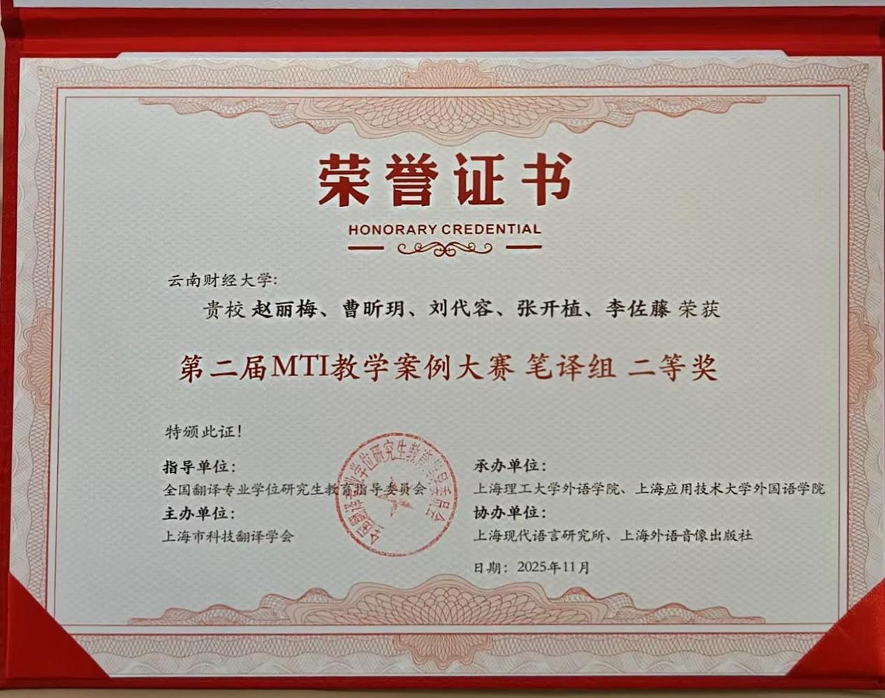 全国MTI教学案例大赛是我国翻译专业研究生教育领域的重要赛事,旨在推动案例式教学方法的普及与提升,促进各高校分享教学成果、交流教学经验。此次获奖既是对参赛师生辛勤付出的回报,更充分展示了云南财经大学国际语言文化学院在翻译专业学位研究生培养方面始终坚持以学生为中心、以实践为导向,将专业能力培养与价值塑造深度融合的积极尝试与探索。