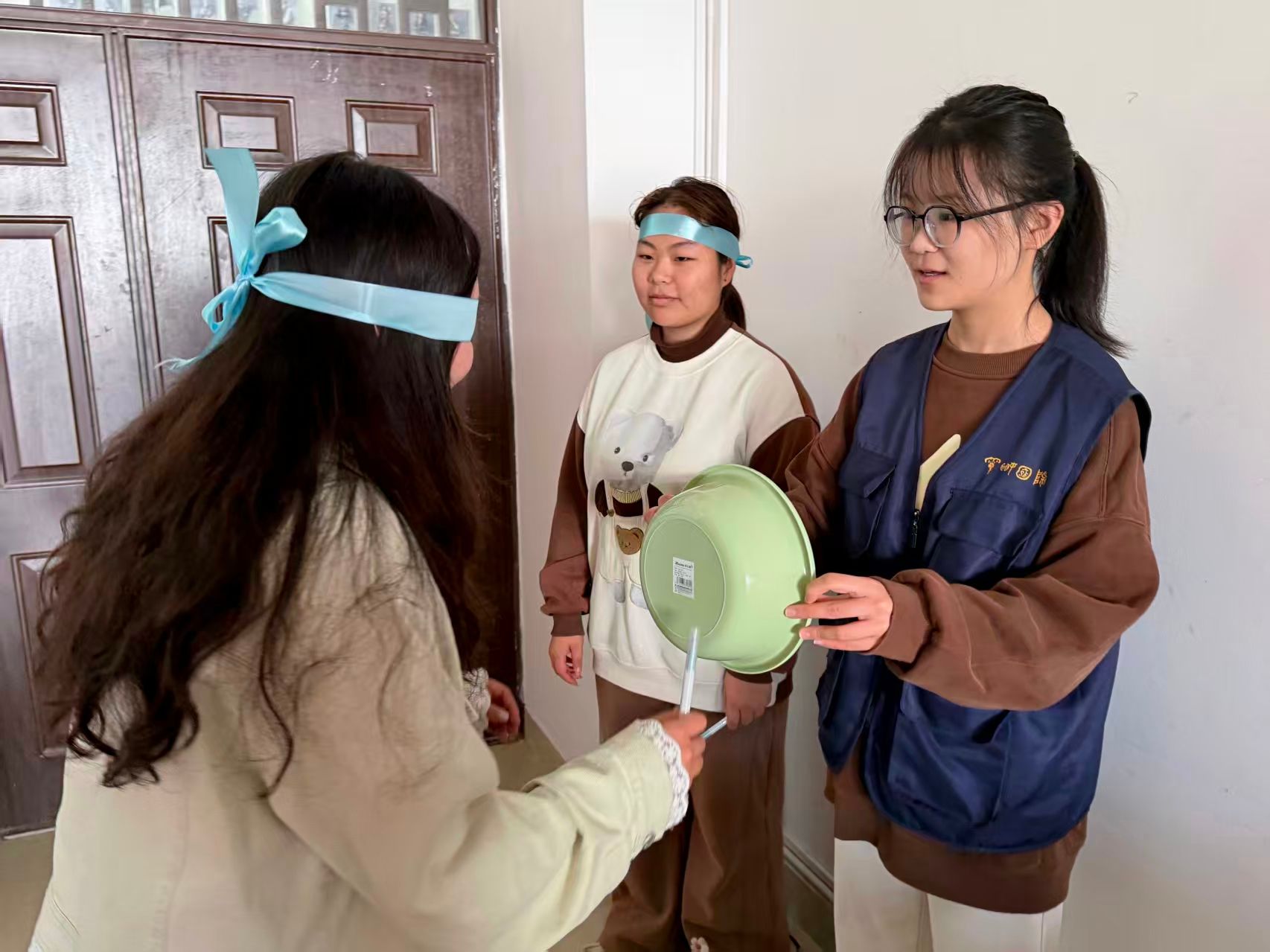活动精心设置三项贴合视障人士日常生活的体验环节,让参与者切身感受到视障群体生活的境遇,号召广大青年积极投身到志愿帮扶的队伍中来,献出自己的一份热心,温暖整个世界。在“蒙眼摸笔”环节,同学们戴上眼罩面对熟悉的粗细笔,只能依靠指尖反复试探辨别,直观体会到视障者依赖触觉认知世界的艰辛;在“蒙眼击鼓”环节,同学们原地旋转十圈后,需在同伴语音指引下摸索向鼓,身体失衡与方向迷失带来的无措,让大家深刻知晓视障者出行要克服的重重未知;在“蒙眼障碍走”环节,以两人配合的形式展开,蒙眼者凭借同伴的语言提示绕过障碍、拾取羽毛球,过程中不仅深化了彼此的信任与配合,也激发了大家的思考——如现实生活中多一些对视障人士的陪伴和指引,世界将变得更加的温暖和美好!