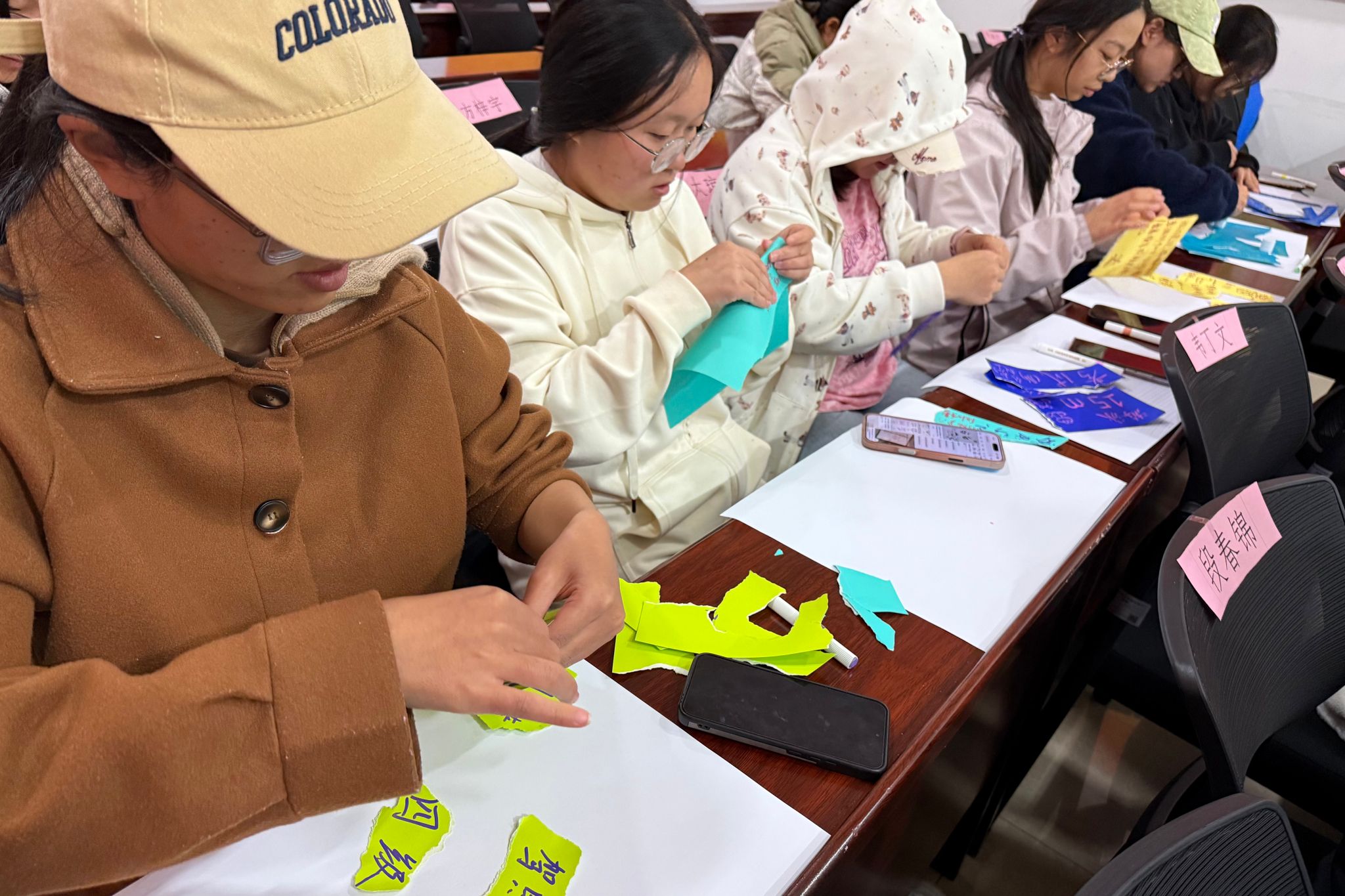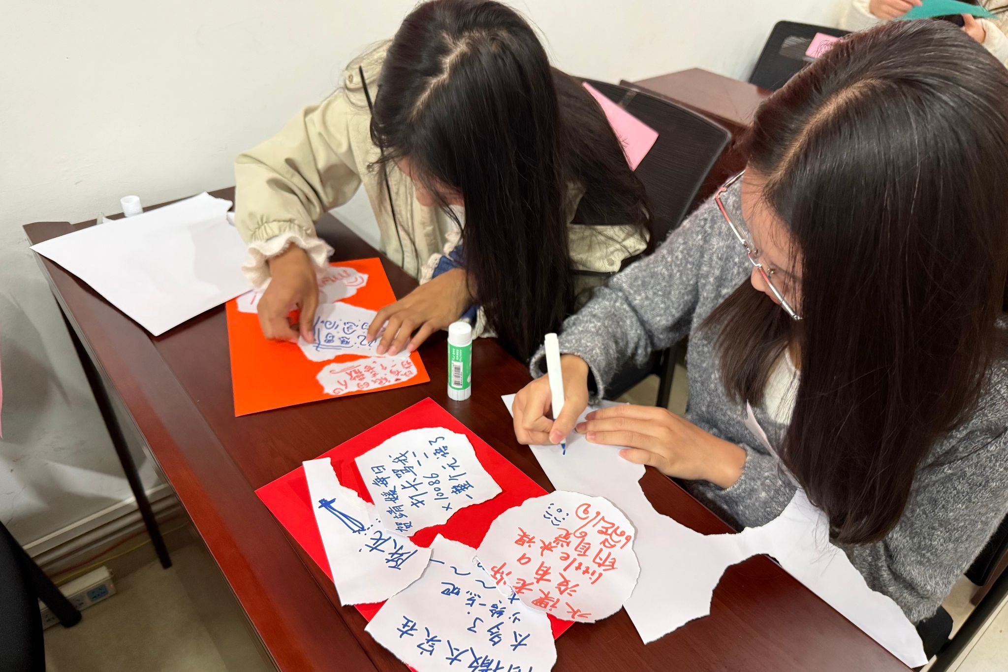 活动分为三个阶段,在创作阶段,舒缓的音乐帮助同学们放松身心,大家将考试压力、思乡之愁等困扰写下或绘成图案,借撕纸释放情绪,再用碎片拼贴出爱心、大树等承载个人情感的作品。在分享阶段,同学们逐一展示作品,分享故事与困扰,交流情绪调节方法,相互慰藉。活动尾声,同学们就期末情绪等问题的疏导方法进行了充分地交流和讨论,呼吁大家主动拥抱积极心态。