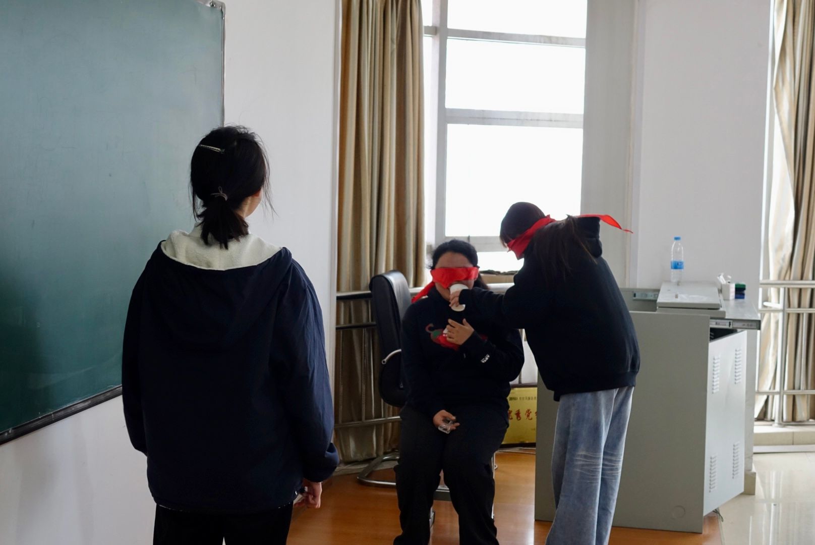 活动设置三项沉浸式体验,让同学们在互动中感受视障群体的生活处境。在“蒙眼辨物大挑战”环节,参与者蒙眼后仅凭触摸、嗅觉,在一分钟内辨别苹果、水杯等常见物品,于趣味竞赛中体会感官的重要性;在“蒙眼找水杯喝水”环节,以三人小组为单位,一人指挥、两人蒙眼完成饮水任务,真切感受视障人士在生活中的不易;在“蒙眼默契传递”环节,则要求两人协作,蒙眼者在同伴引导下将物品从起点传递至指定位置,既考验团队配合,也让大家深刻认识到视障群体对帮扶的需求。整场活动安全有序,同学们在体验中思考,在互动中传递温情。