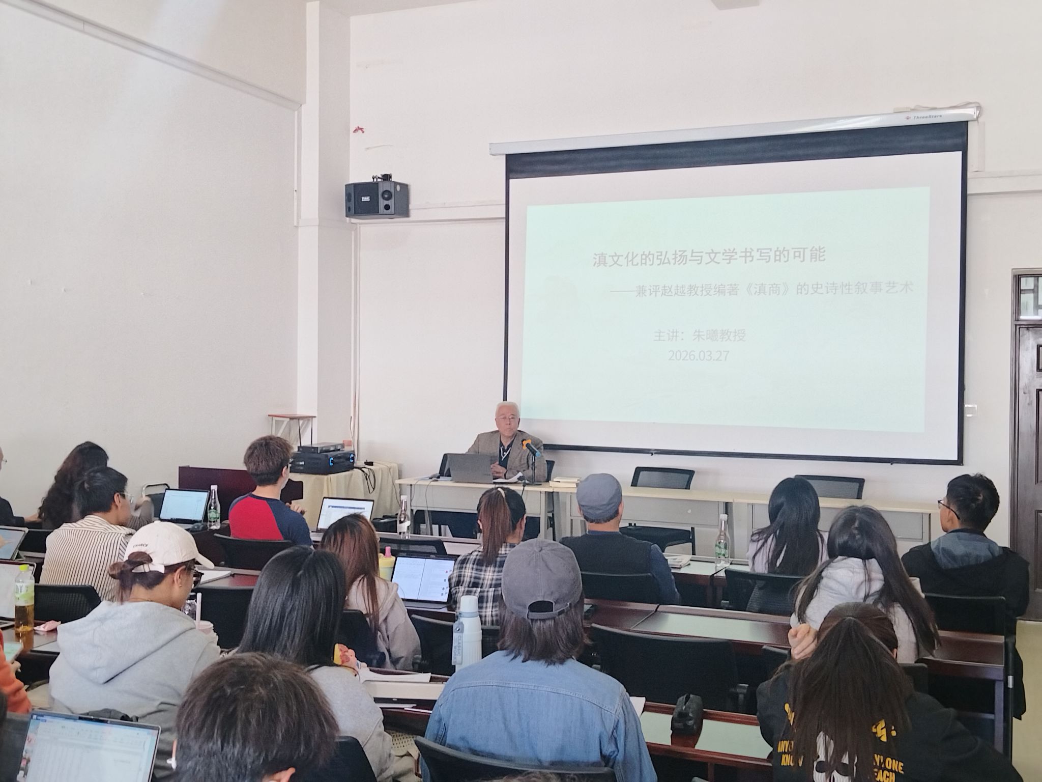 2026 年 3 月 27 日,云南师范大学教授、昆明文理学院云南乡村数字文化研究中心主任朱曦老师为学院师生带来 “滇文化的弘扬与文学书写的可能” 主题讲座。本次讲座以滇文化传承为核心,兼评赵越教授《滇商》史诗性叙事艺术,为云南文化弘扬与文学创作指明方向,现场学术氛围浓厚,听众反响热烈。