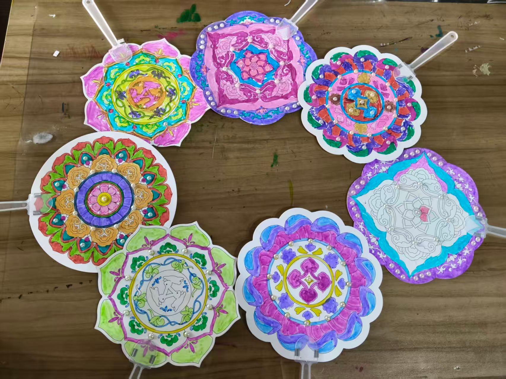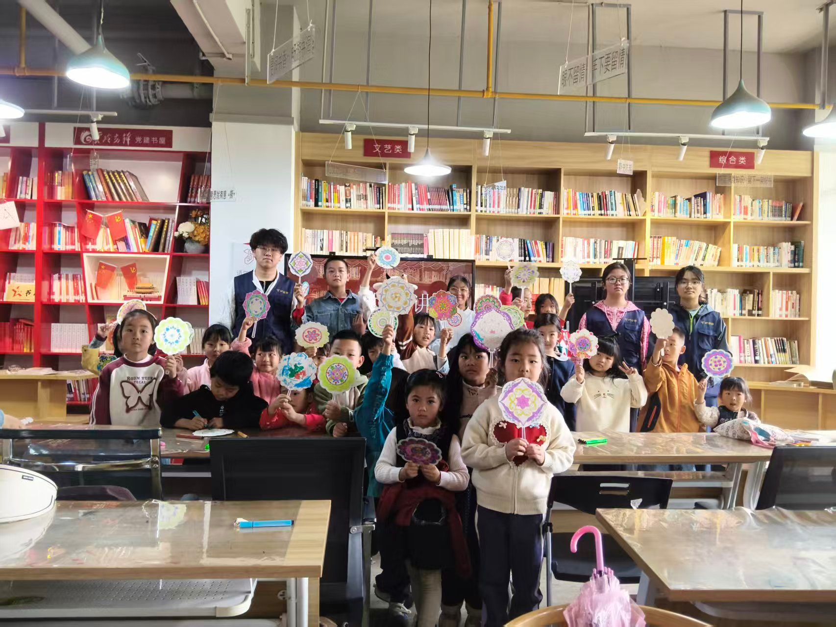 活动精心设计三大环节,带领孩子们沉浸式走近敦煌藻井艺术。初识敦煌环节,志愿者先为孩子们讲解敦煌的地理位置与文化价值,随后开展趣味敦煌色彩教学,在介绍石青、石绿、朱砂红等传统色彩的同时,同步教授对应英语单词,让孩子们感受传统美学的同时丰富知识储备。科普环节中,孩子们通过视频了解到藻井是古代建筑天花板的精美装饰,深入知晓莲花藻井、飞天藻井、三兔藻井等经典纹样的美好寓意,加深对非遗文化的理解。在最后的实操创作环节,志愿者们细致地讲解了扇面配色技巧与绘制步骤,耐心引导孩子们分区涂色,孩子们将传统色彩的独特韵味融入创作,一件件色彩鲜明、童趣盎然的敦煌扇面作品在指尖诞生。