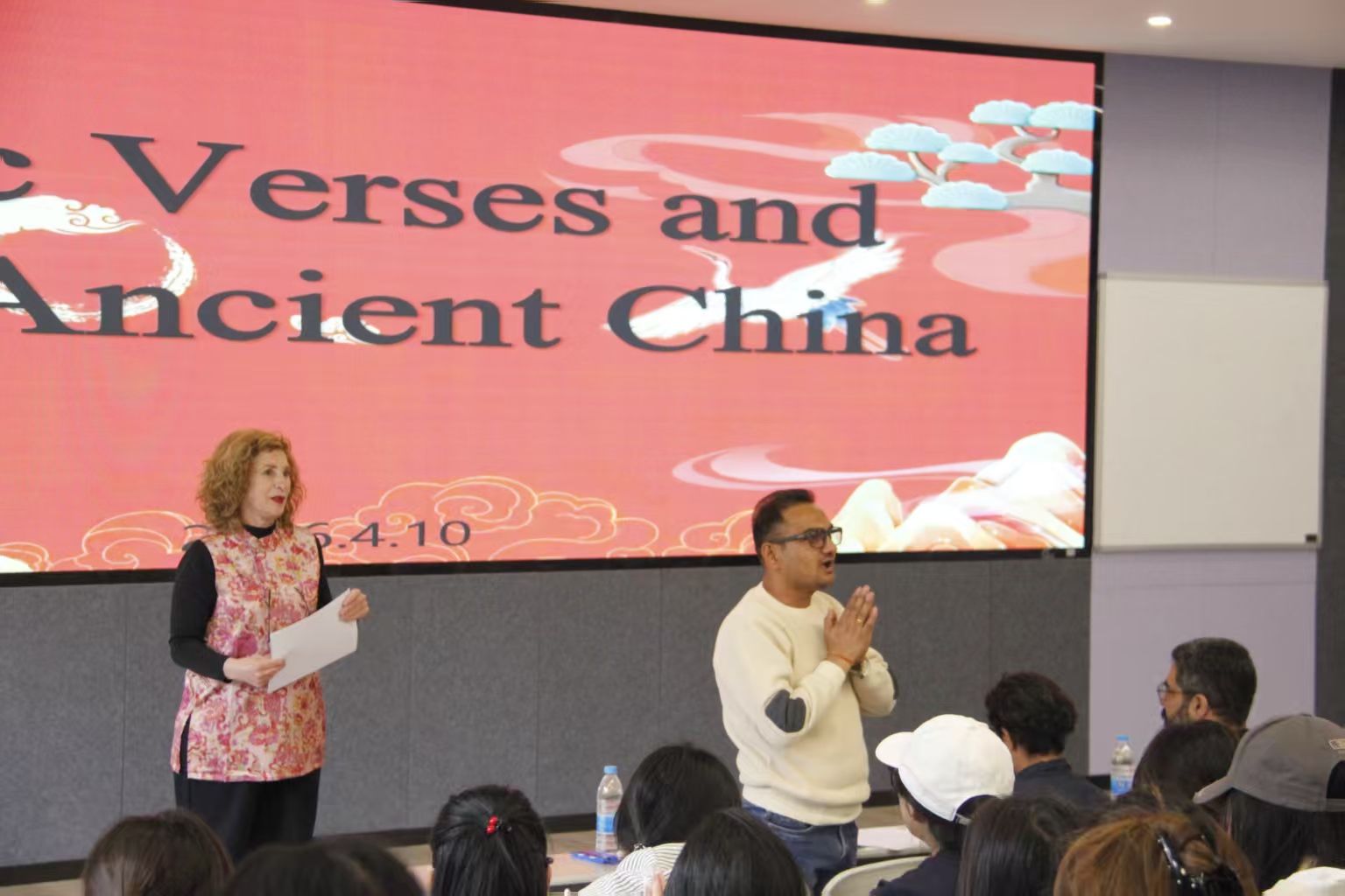 活动由外教老师Rouhe主持,以中国古典诗词与经典文化为核心,以英语为桥梁,助力中华优秀传统文化传播。活动中,越语24-1班同学诵读李清照《如梦令·常记溪亭日暮》,尽显古诗词韵味;泰语24-1班同学朗诵苏轼《水调歌头》,感染力十足;汉语25-1班同学演绎《论语》选段,带领观众感悟先人智慧。同学们满怀热情参与展示,在互动中收获满满,为活动画上圆满句号。