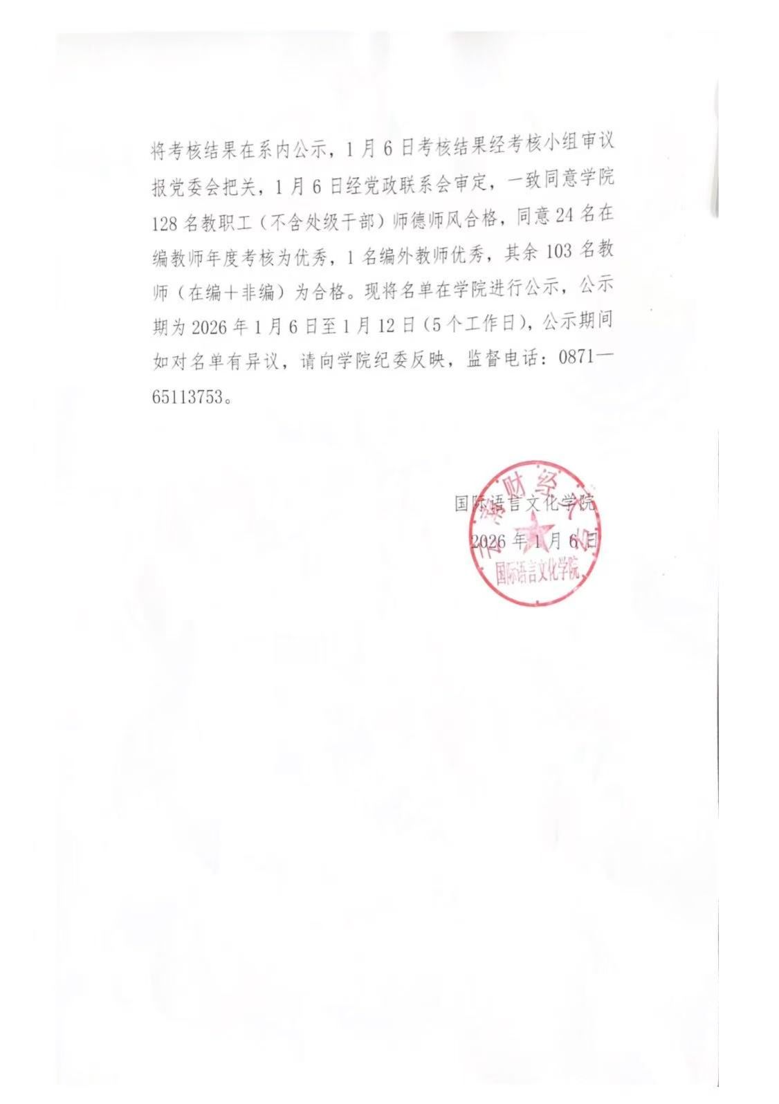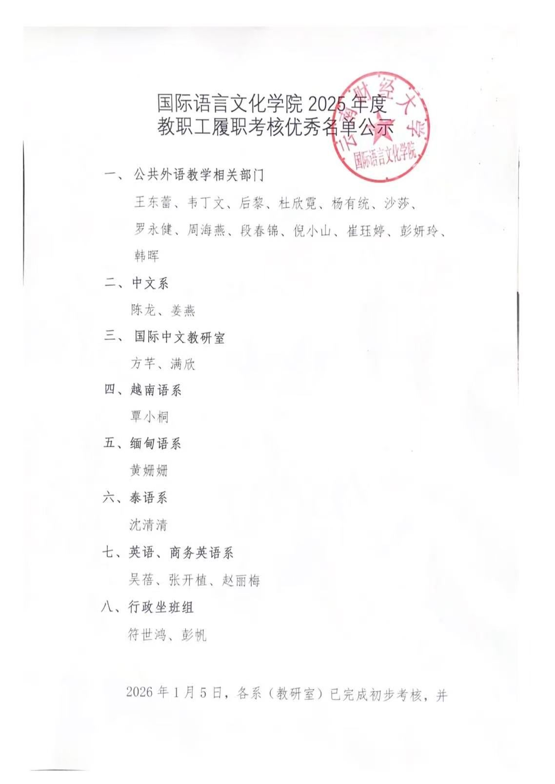 国际语言文化学院2025年度考核结果公示